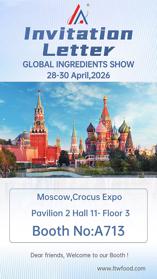 我们荣幸地宣布,龙泰威(江苏)食品科技有限公司 将于 2026 年 4 月 28 日 - 4 月 30 日,携核心产品与全场景食品配料解决方案,重磅亮相 2026 年俄罗斯莫斯科食品配料展览会(Global Ingredients Show),诚邀全球合作伙伴、行业同仁莅临展位交流洽谈,共拓欧亚市场新蓝海,共筑食品行业新未来!