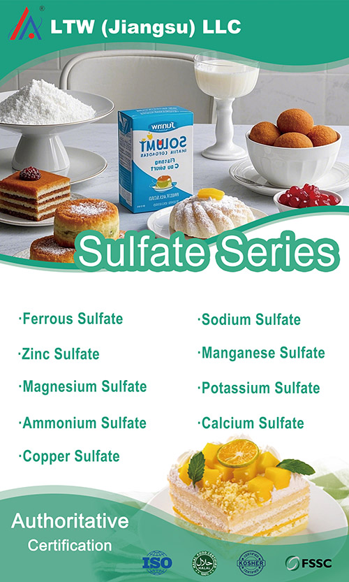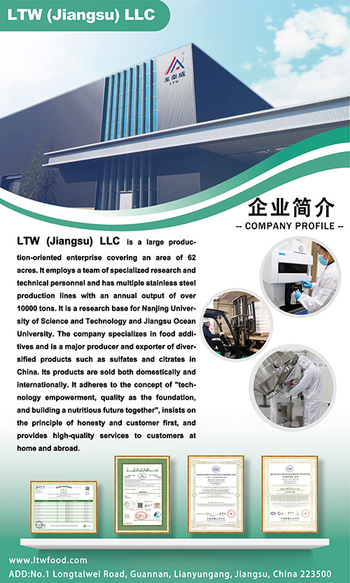 龙泰威(江苏)食品科技有限公司 专注于食品添加剂与配料的研发、生产与销售,致力于为全球客户提供安全、健康、高效的食品配料解决方案。公司产品涵盖硫酸盐、柠檬酸盐等多个品类,广泛应用于食品、饮料、膳食补充剂及饲料等领域。